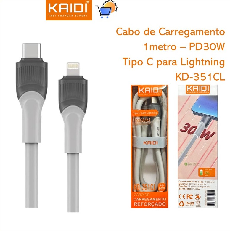 Cabo Tipo-C para Lightning Kaidi KD-351CL – 1 Metro, Carregamento Rápido