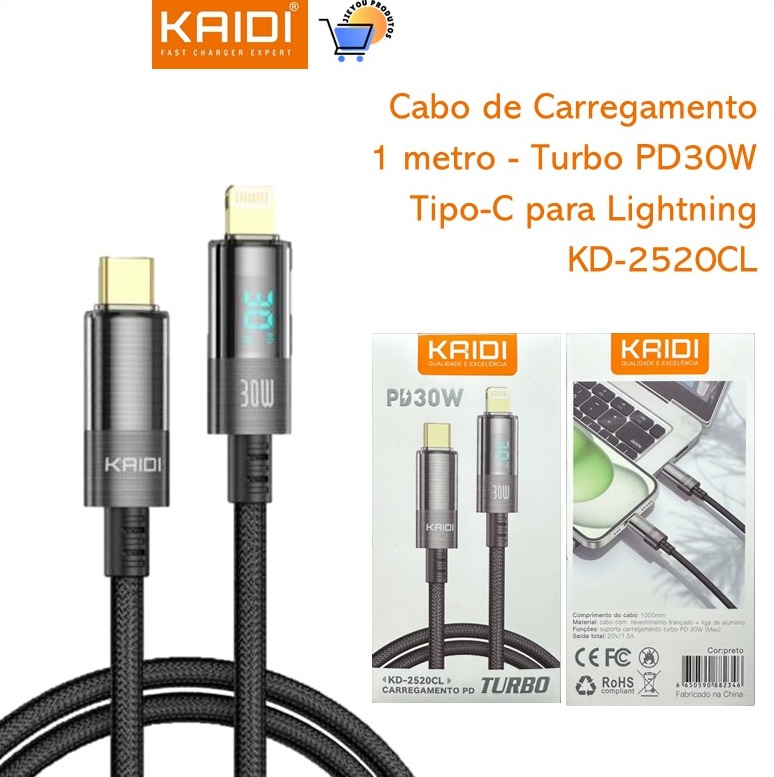 O Cabo Tipo-C para Lightning Kaidi KD-2520CL combina rapidez e inovação, proporcionando carregamento turbo e transferência de dados rápida. Com uma tela LED integrada, você acompanha em tempo real a potência do carregamento, garantindo mais controle e segurança.