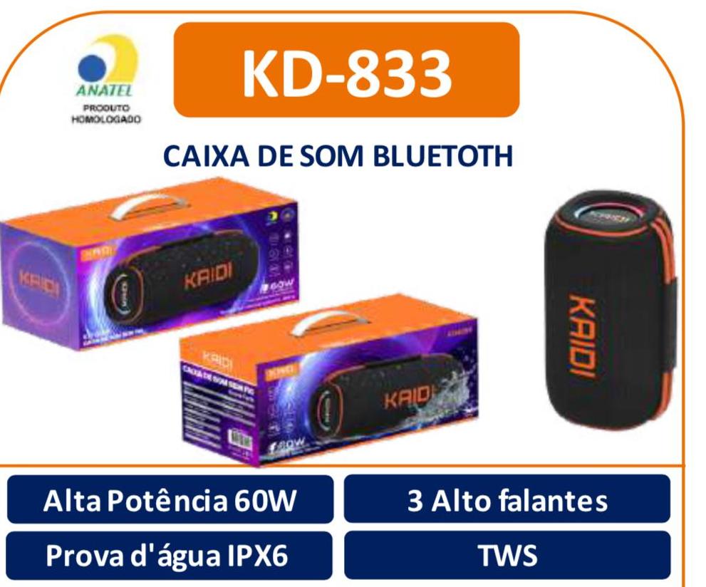 A Caixa de Som Sem Fio Kaidi KD-833 foi projetada para quem busca qualidade sonora, resistência e autonomia. Com 60W de potência, oferece um som potente e nítido, ideal para festas, encontros ou momentos de relaxamento.