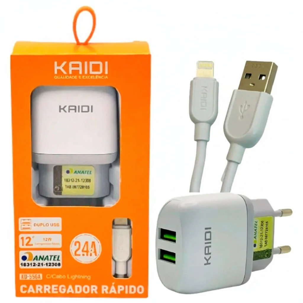 O Kaidi KD-556A é a escolha certa pra quem quer carregamento rápido, seguro e eficiente. Ele já acompanha cabo Lightning, ideal para iPhones, e ainda conta com duas portas USB, permitindo carregar dois dispositivos ao mesmo tempo com desempenho estável.