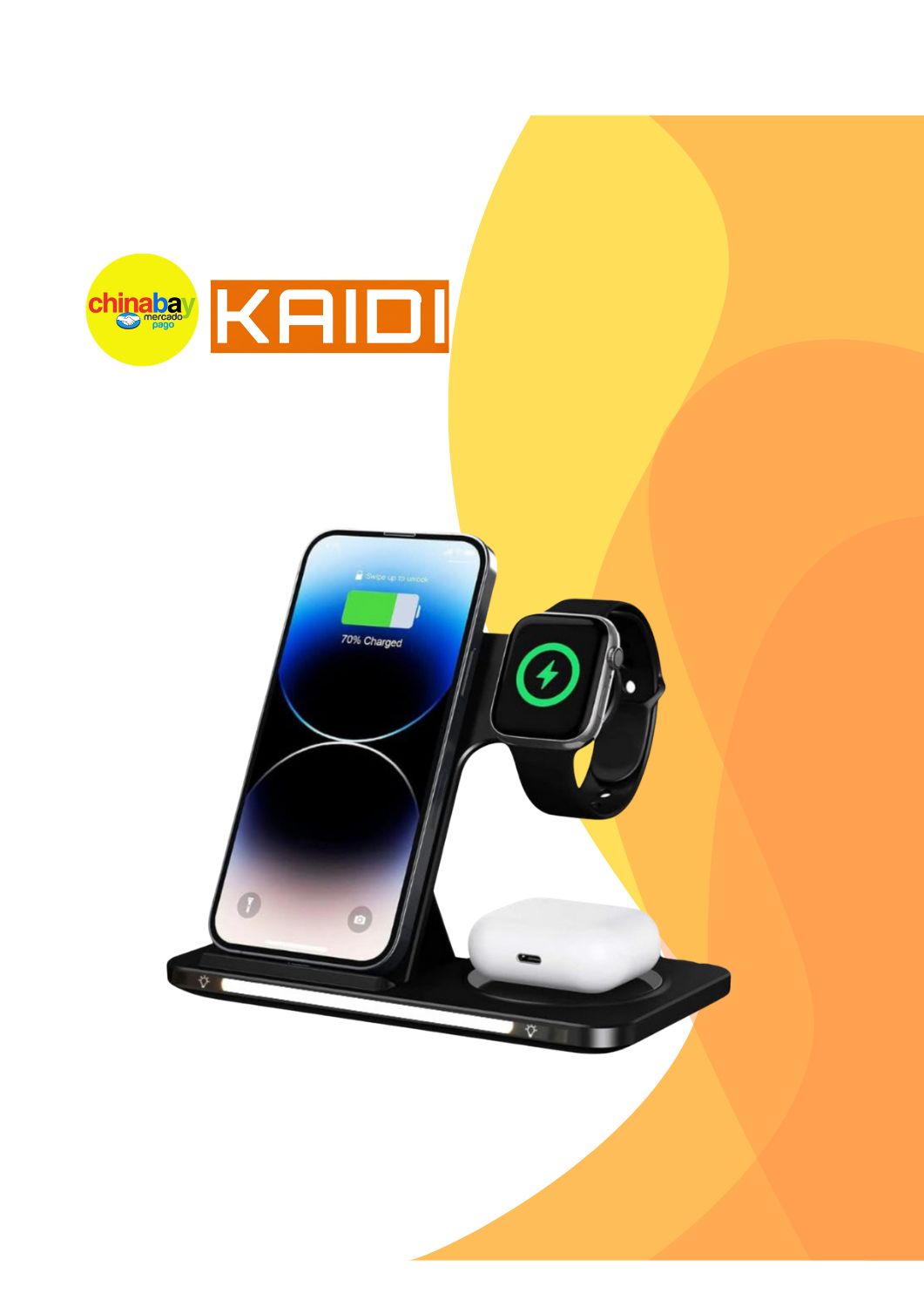 3 em 1: Carrega celular + smartwatch + fones simultaneamente.