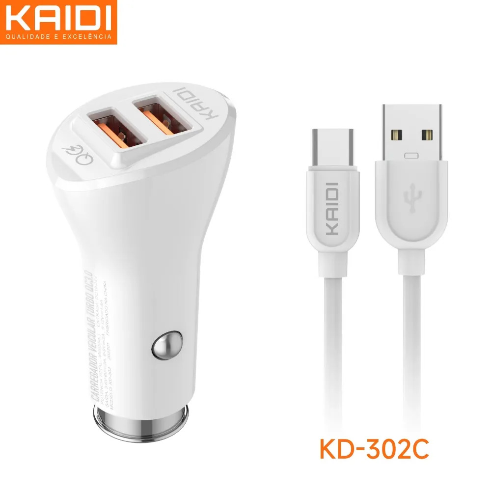 O Carregador Veicular Kaidi KD-302C oferece carregamento turbo 3.0, garantindo recargas rápidas e seguras para seus dispositivos. Ele possui duas saídas USB, permitindo carregar dois aparelhos simultaneamente com eficiência.