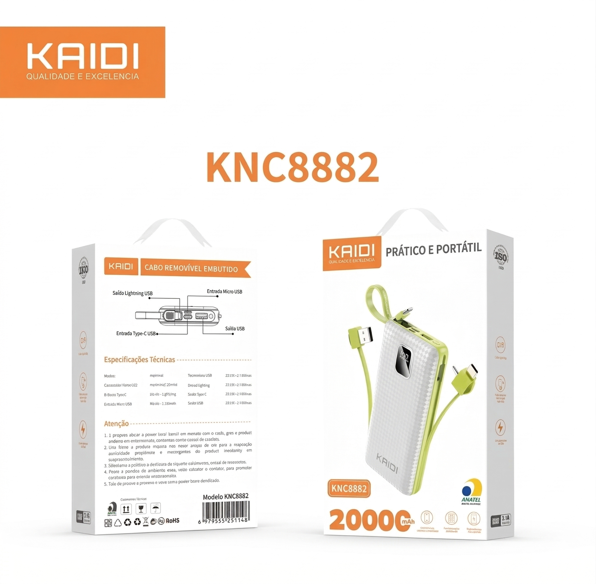 Power Bank 20.000mAh Kaidi KNC882 – Carregamento Rápido com Máxima Versatilidade